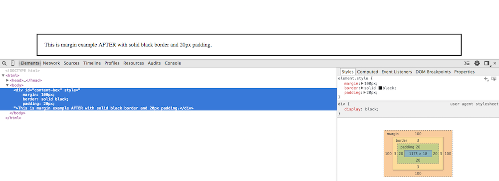 In this step, I added 20 pixels of padding- the space between the text itself and the black solid line. You can see the margin, border, and padding boxes checked in the Style panel at the bottom right corner of the screen. Similarly, the new modifications are now visible in the HTML code in the Elements panel.
