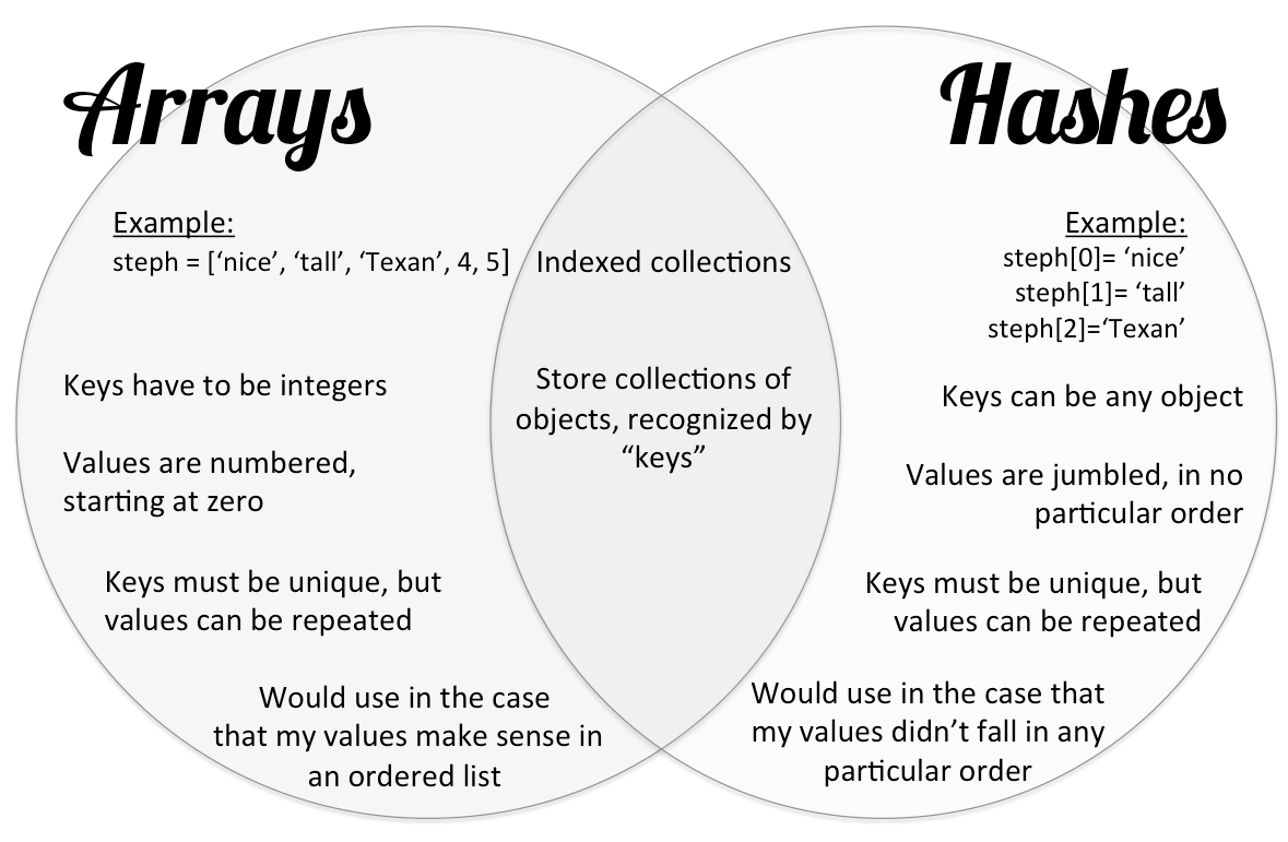 Ruby provides various options for storing information- arrays and hashes are two examples. Similar to when we made the distinction in HTML between ordered and unordered lists, arrays store ordered data whereas hashes can hold more arbitrary data. More specifically, arrays are simple lists with each data point assigned a number, starting at zero. Hashes, due to their unordered nature, can be identified by any object and can hold more than one data point.