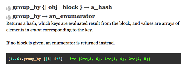 You have a data set, an array, that needs to be separated by categories in a hash. If "group_by" sounds like the method you wanted to use on your enumerable, you probably started with a quick Google search and referenced Ruby Docs. But, if you're new to this game, like me, you probably weren't sure how to make sense of the explanation Ruby Docs gives below.