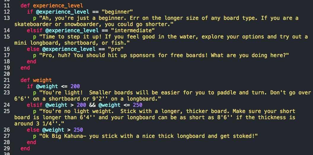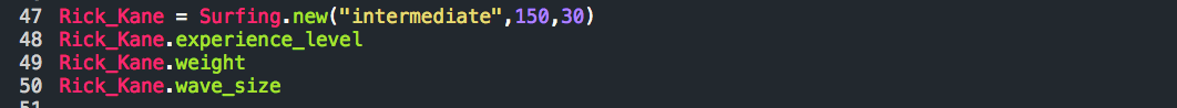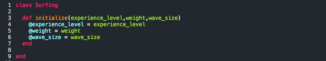 Once we've named our class, we'll initialize the instance variables we intend to use. We're going to need to know Rick's experience level, weight, and what size waves he plans to ride to give him the best advice on a board.