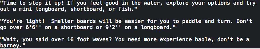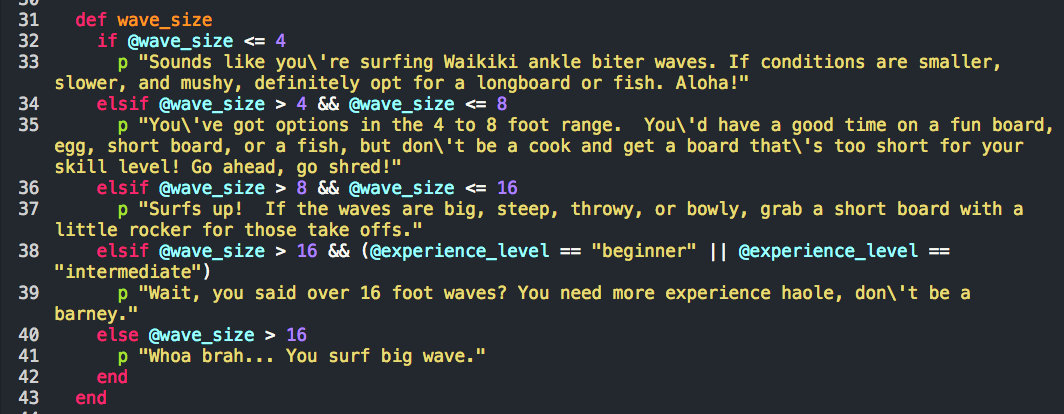 Here is a unique situation: sometimes beginners don't have a sense for their limits and go for bigger waves than they are ready for. Just because Rick thinks he is capable of surfing pipeline, doesn't mean he's ready for it or that he should be riding a gun! Sometimes you just need to be called out and that's what this method does when wave size is over 16 feet and the experience level is either beginner or intermediate (line 38).